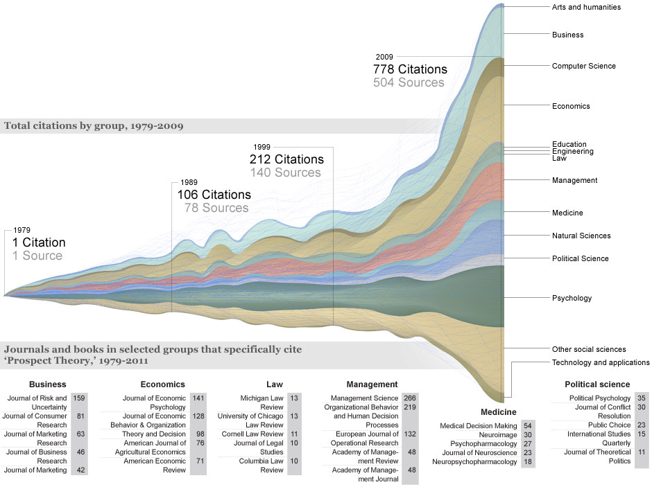 Based on thousands of citation records from Thomson Reuters, this chart shows the scholarly influence of «Prospect Theory: An Analysis of Decision Under Risk,» written by Daniel Kahneman and Amos Tversky, and published in Econometrica in 1979. The theory has turned up as a reference for an increasing number of journal articles and book chapters (nearly 8,000 items in all), and it has spread into a diverse range of disciplines. Thomson Reuters makes an effort to classify the major scholarship within journals and books into 280 categories; this representation of the paper’s influence condenses these classifications even further.